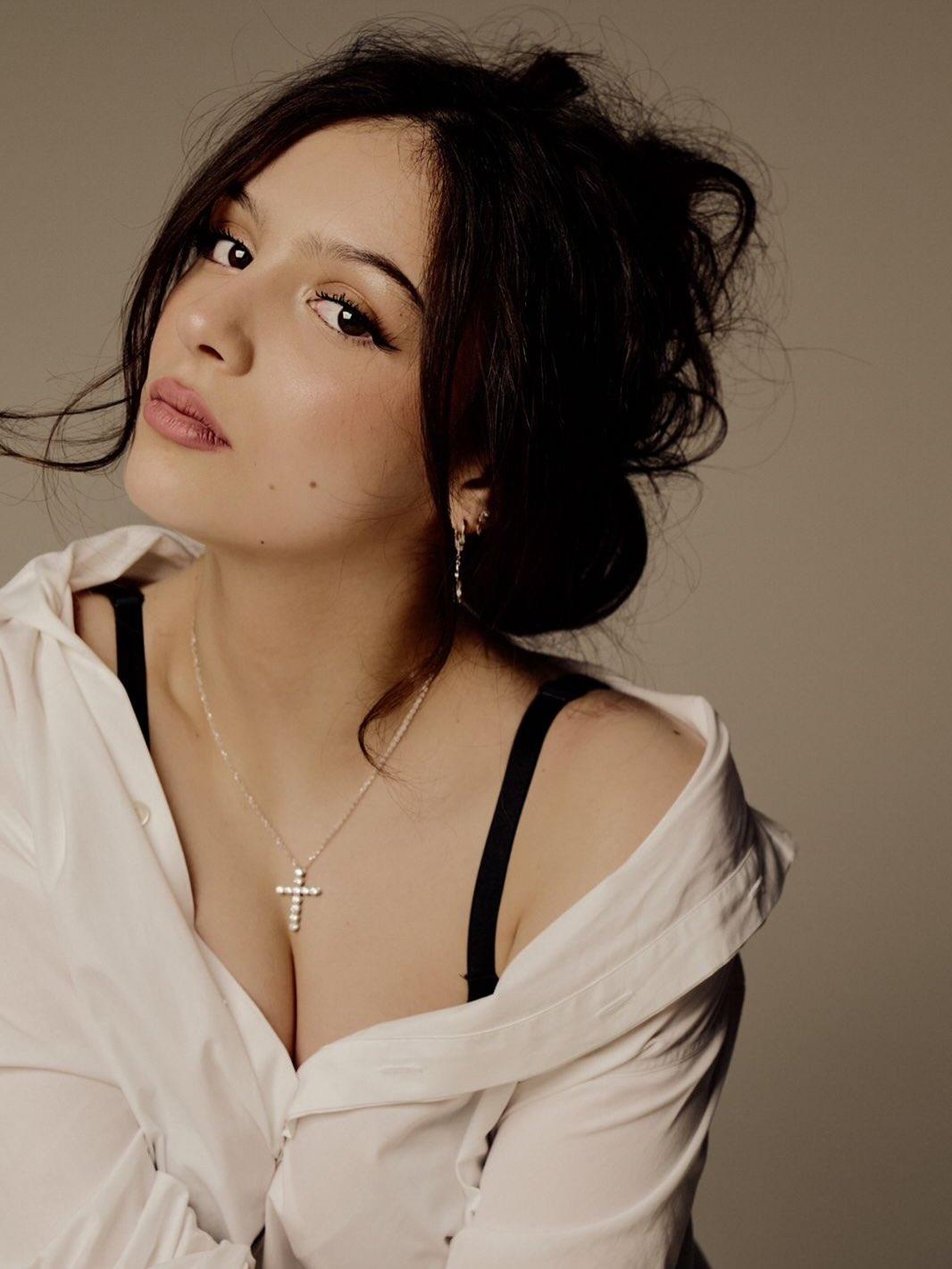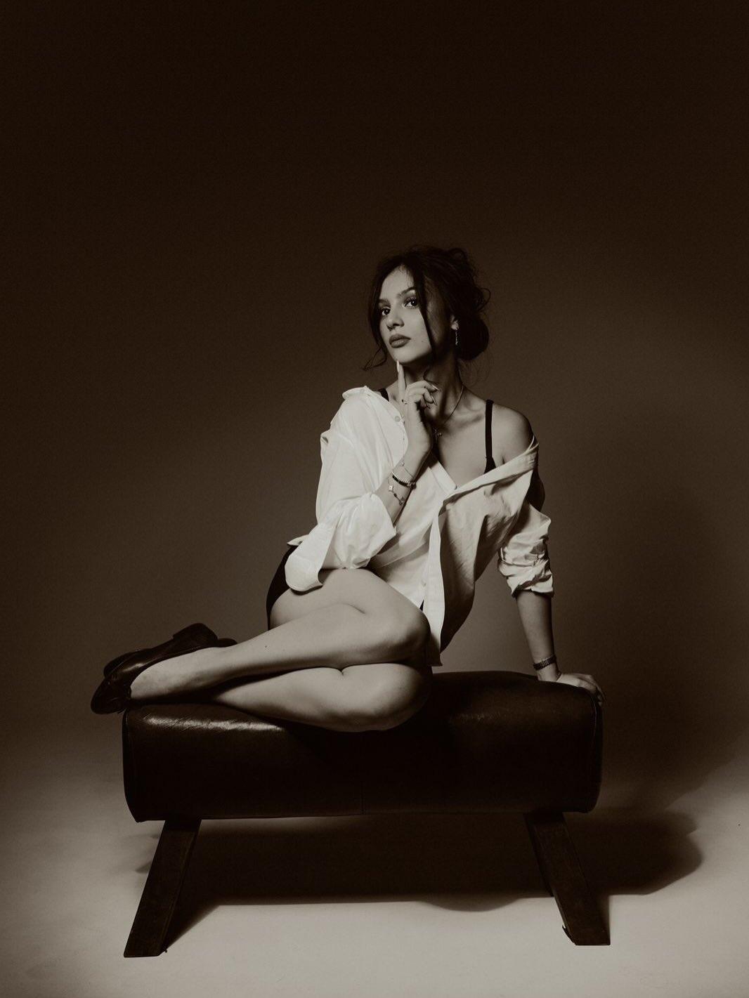 На снимках в нуарной стилистике Иванна выглядит загадочно и утончённо. Волосы собраны в небрежный пучок, а образ построен на контрасте чёрного и белого. Для фотосессии она выбрала чёрное мини-платье на бретелях с выразительным декольте и белую рубашку. Завершают образ чёрные лодочки без каблука.
