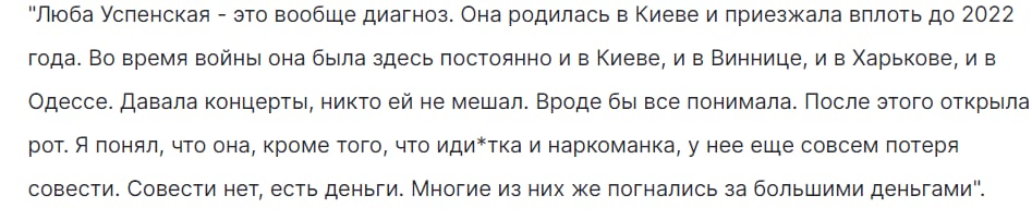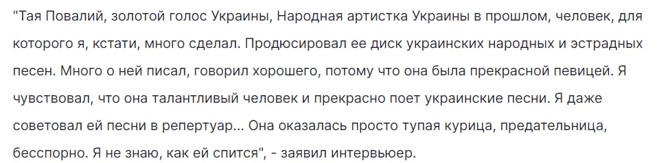 Он вспомнил конфликт с В. Талызиной, которая резко отреагировала на его позицию по вопросу принадлежности Крыма. Не менее эмоционально журналист высказался о Л. Успенской, отмечая, что певица, долгое время выступавшая в Украине, со временем, по его мнению, проявила безразличие к происходящему и поставила материальные интересы выше моральных принципов.