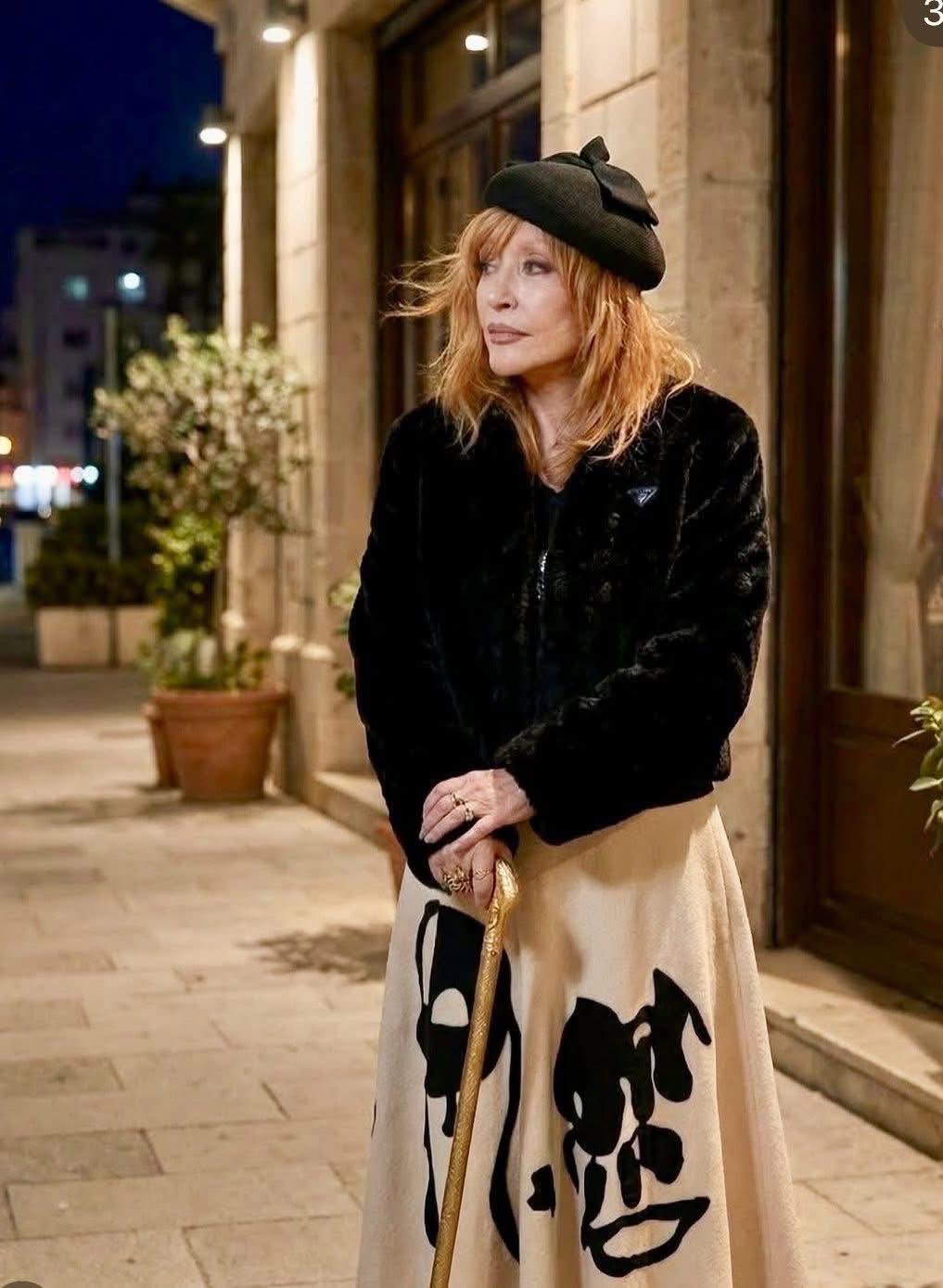На втором снимке певица садится в чёрный автомобиль: чёрная шуба Prada, чёрный берет с бантом, светлая юбка с принтом, массивные украшения и сигарета в изящном мундштуке. Охранник держит её трость и большой букет красных роз, пока Алла Борисовна держится за дверцу машины.